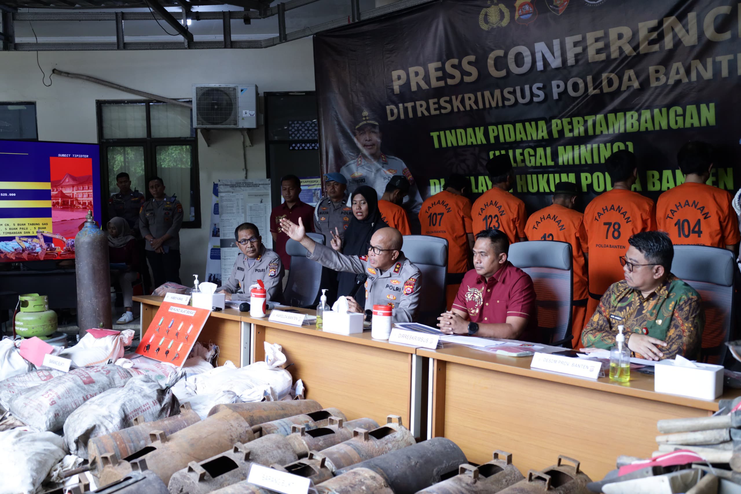 Press Conference dipimpin oleh Kapolda Banten Irjen Pol Hengki yang didampingi Dirreskrimsus Polda Banten Kombes Pol Yudhis Wibisana serta Plt Kabid Humas Polda Banten AKBP Meryadi dan Kadis ESDM Provinsi Banten Arijames Farrady. Kegiatan berlangsung di Kantor PUPR Provinsi Banten pada Kamis (04/12)
